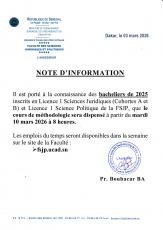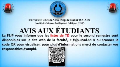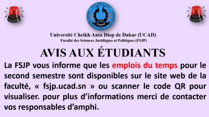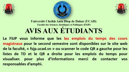 La FSJP vous informe que les Emplois de temps des TD pour le second semestre 2024-2025 sont disponibles sur le site web de la faculté, « fsjp.ucad.sn » pour plus d’informations merci de contacter vos responsables d’amphi.